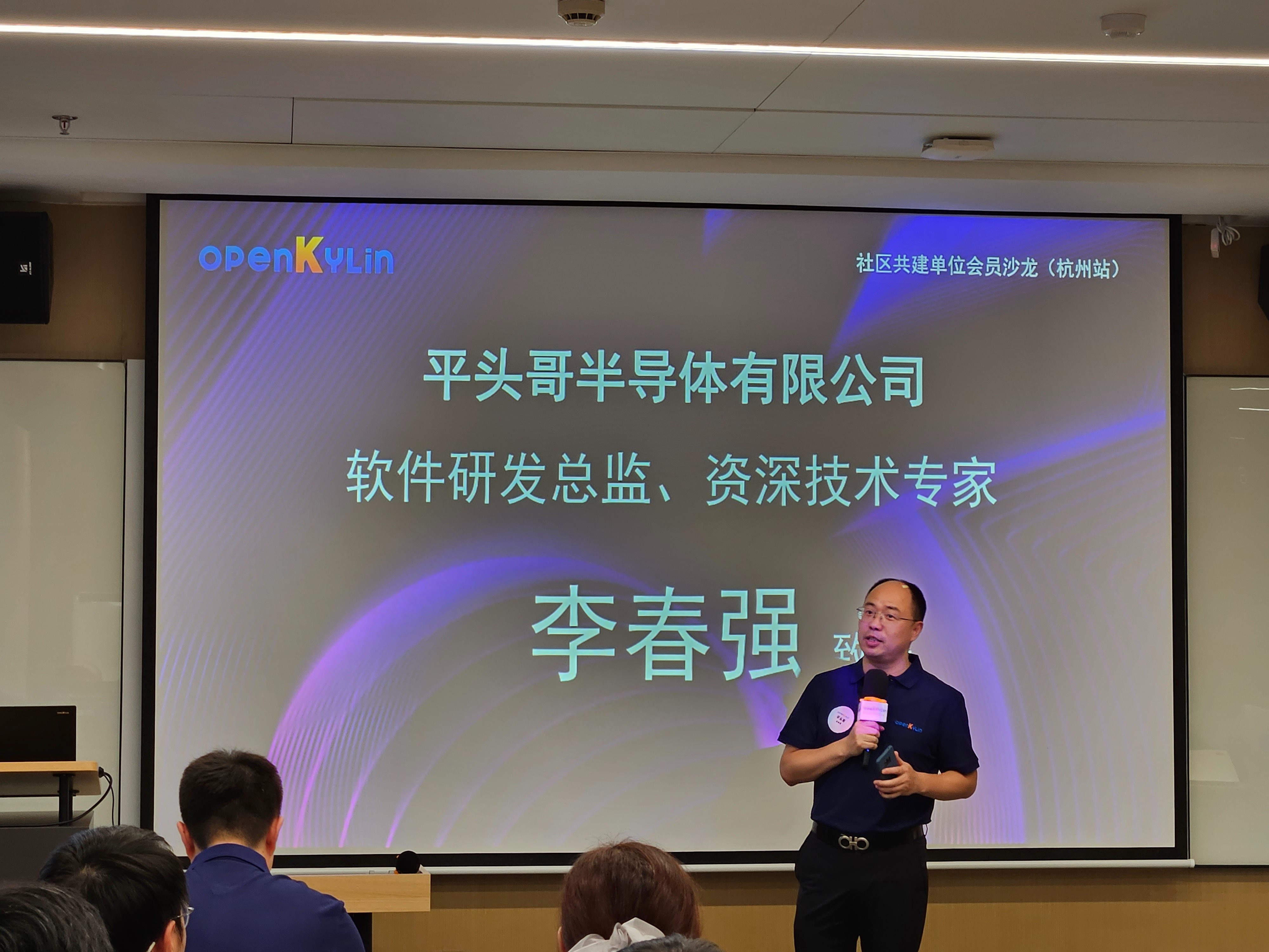 平头哥半导体有限公司软件研发总监李春强为此次沙龙致辞并表示,欢迎大家来到位于杭州的美丽的阿里园区参加由openKylin社区主办,平头哥承办的共建会员沙龙,平头哥作为openKylin社区合作伙伴,将共同推动社区RISC-V生态繁荣发展。
